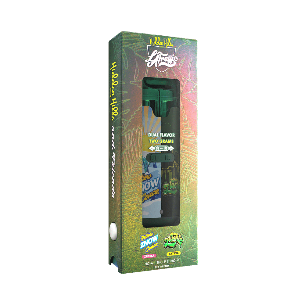Turn every session into a flavor-packed experience with the LA Traffic x Hidden Hills Dual Chamber Disposable – Zlushie & Yellow Znow Cone. This exclusive 2g device brings two standout strains together in one sleek, rechargeable vape built for convenience and variety. Zlushie delivers a fruity, slushy-inspired profile with uplifting, euphoric effects that brighten your mood, while Yellow Znow Cone offers a refreshing citrus twist with smooth, relaxing undertones perfect for unwinding. With the dual chamber design, you can switch between strains instantly, tailoring each hit to your vibe. Complete with USB-C charging for fast, reliable recharges, this collaboration blends LA Traffic’s bold flavor with Hidden Hills’ premium craftsmanship. Enjoy powerful effects, vibrant flavors, and discreet design—all in one collectible dual strain device.